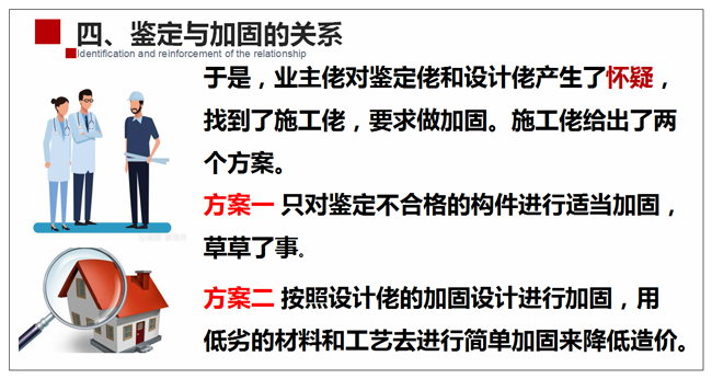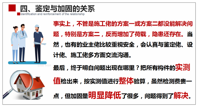 所以呢,不管是可靠性鑒定、抗震性鑒定等等的鑒定報告都只是證明這棟建筑有沒有問題,但不能把鑒定報告作為加固的依據(jù),有問題的需要加固,可以采取補(bǔ)充抽檢,最起碼豎向構(gòu)建、大跨度梁等等要弄清楚,這是我對鑒定與加固的一些思考。