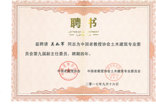 熱烈祝賀廣州勝特加固公司董事長吳如軍先生受聘為“中國老教授協(xié)會土木建筑專業(yè)委員會第九屆副主任委員”。 在從業(yè)的二十余年間,吳董事長從沒間斷過在建筑物的病害治理及加固改造托換糾傾領(lǐng)域堅(jiān)持不懈的努力,獲得十余項(xiàng)國家專利,多項(xiàng)工法與科技成果,參編多本規(guī)范與行業(yè)叢書,發(fā)表多篇有價(jià)值的行業(yè)論文,為行業(yè)發(fā)展做出了貢獻(xiàn)。先后獲得全國民營科技發(fā)展貢獻(xiàn)獎(jiǎng)、廣東省科學(xué)技術(shù)獎(jiǎng)、土木建筑學(xué)會頒發(fā)的“第三屆詹天佑故鄉(xiāng)杯”、廣東省土木建筑學(xué)會科學(xué)技術(shù)獎(jiǎng)、廣州市科學(xué)技術(shù)獎(jiǎng)、廣州市白云區(qū)科學(xué)技術(shù)獎(jiǎng)等多個(gè)獎(jiǎng)項(xiàng),廣東省土木建筑學(xué)會工程施工專業(yè)委員會頒發(fā)“先進(jìn)個(gè)人稱號”,并受聘為“廣東省土木建筑學(xué)會專家?guī)?rdquo;專家、“廣東省工程防水與加固專家委員會專家?guī)?rdquo;專家、“廣東工業(yè)大學(xué)研究生導(dǎo)師”等。 此次受聘為“中國老教授協(xié)會土木建筑專業(yè)委員會第九屆副主任委員”更是對吳董事長工作的肯定。