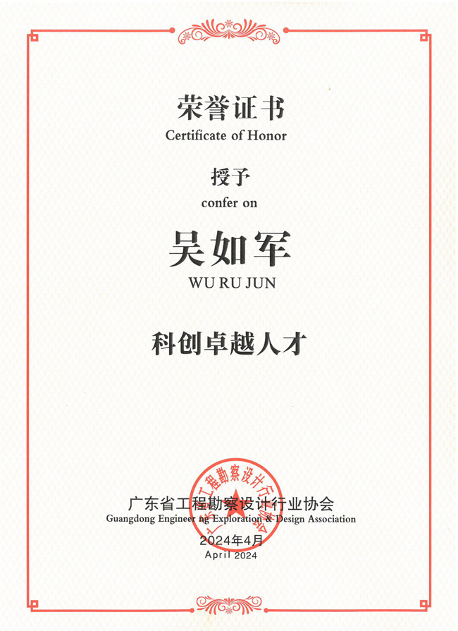 會議中,評出第三屆廣東省杰出工程勘察設計師49人,廣東省工程勘察設計行業(yè)科創(chuàng)卓越人才40人,我司吳如軍董事長被評為“廣東省工程勘察設計行業(yè)科創(chuàng)卓越人才”。