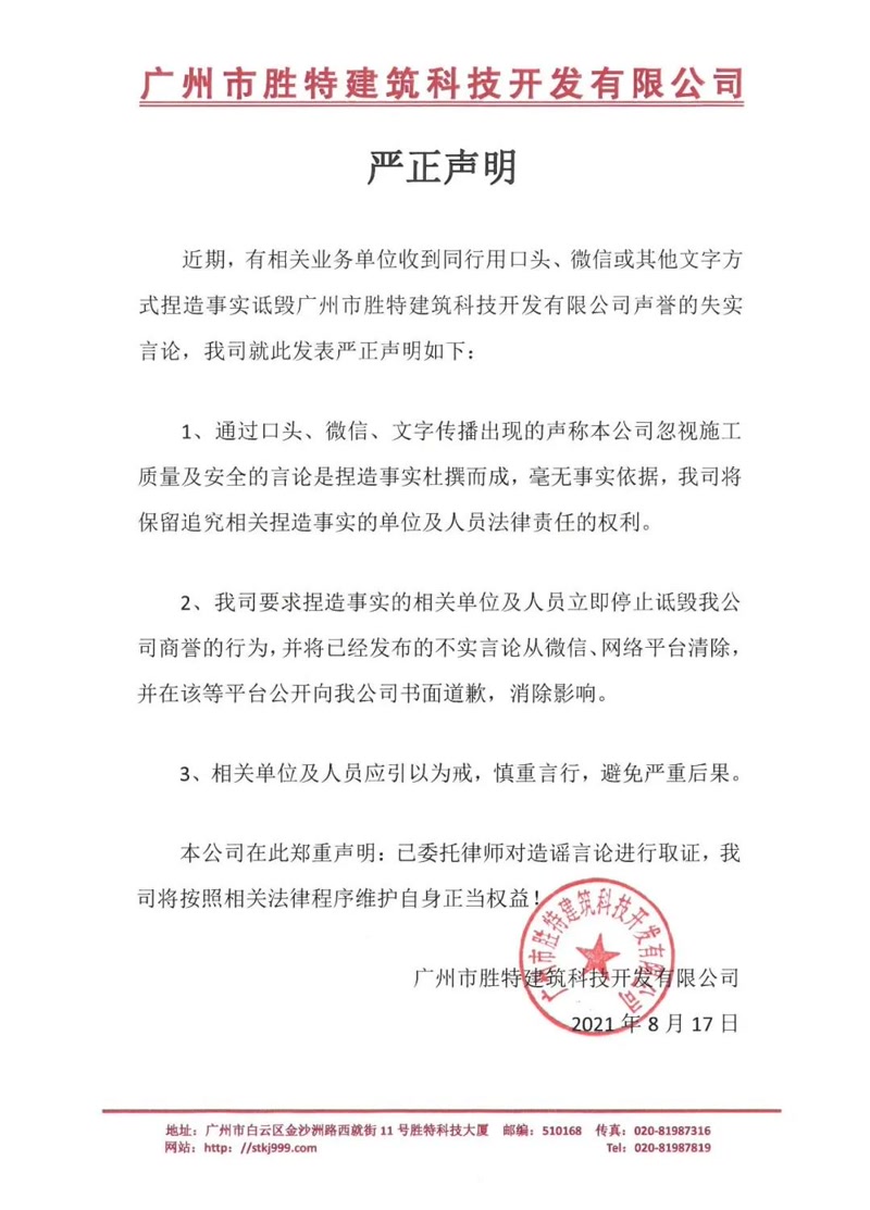 近期,有相關(guān)業(yè)務(wù)單位收到同行用口頭、微信或其他文字方式捏造事實(shí)詆毀廣州市勝特建筑科技開發(fā)有限公司聲譽(yù)的失實(shí)言論,我司就此發(fā)表嚴(yán)正聲明如下: