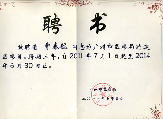 2011年7月12日下午由廣州市監(jiān)察局頒發(fā)證書儀式,我司副董事長曾春航先生參加了此次會議并領(lǐng)取了證書。