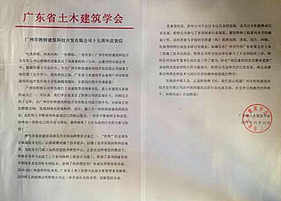 2013年12月13日是廣州市勝特建筑科技開發(fā)有限公司“感恩十五載創(chuàng)譽(yù)贏未來”十五周年慶典活動的大日子,來自省、市、區(qū)領(lǐng)導(dǎo)代表及建筑界的精英、行業(yè)前輩、專家、學(xué)者紛紛前來恭賀,其中廣東省土木建筑學(xué)會名譽(yù)理事長(原廣東省建設(shè)廳廳長)陳之泉先生、副理事長(原廣州市政協(xié)副主席)黎寶松教授級高工、副理事長兼秘書長王離教授級高工攜廣東省土木建筑學(xué)會同仁給勝特公司送來十五周年慶賀信。