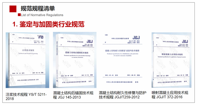 還有像《注漿技術(shù)規(guī)程 YS/T 5211-2018 》《混凝土結(jié)構(gòu)后錨固技術(shù)規(guī)程 JGJ 145-2013》《混凝土結(jié)構(gòu)耐久性修復(fù)與防護技術(shù)規(guī)程 JGJ/T259-2012》《噴射混凝土應(yīng)用技術(shù)規(guī)程 JGJ/T 372-2016》等等,這些都是屬于加固類相關(guān)規(guī)范。