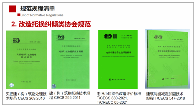 我是做加固改造行業(yè)的,下面的加固改造托換糾傾類協(xié)會規(guī)范的參編工作,我都參與其中,《混凝土結(jié)構(gòu)耐久性修復(fù)與防護技術(shù)規(guī)程 JGJ/T259-2012》這本我也參與了,主要講材料的耐久性、錨固深度以及連接點的有效性等等。《災(zāi)損建(構(gòu))筑物處理技術(shù)規(guī)范 CECS 269:2010》這本是汶川地震之后,我們才編的規(guī)范。《建(構(gòu))筑物托換技術(shù)規(guī)程 CECS 295:2011》這本新的技術(shù)規(guī)程將在今年出版,我擔任主編人,在2011年版我擔任參編人。《老舊小區(qū)綜合改造評價標準 T/CECS 880-2021、T/CRECC 05-2021》,老舊小區(qū)前面介紹過,建筑物有20年以上歷史的就稱為老舊小區(qū),就需要進行評價,評價不合格的需要改造、維修、加固。