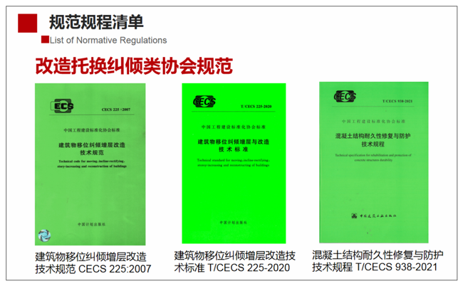 隨著我國建筑行業(yè)的發(fā)展,很多建筑物都出現(xiàn)需要平移、糾傾、增層改造等情況,我們在2007年就編了《建筑物移位糾傾增層改造技術(shù)規(guī)范 CECS 225:2007》,在2020年又重新修編完成《建筑物移位糾傾增層改造技術(shù)標(biāo)準(zhǔn) T/CECS 225-2020》,前面說到的《混凝土結(jié)構(gòu)耐久性修復(fù)與防護(hù)技術(shù)規(guī)程 JGJ/T259-2012》,也在2021年修編成《混凝土結(jié)構(gòu)耐久性修復(fù)與防護(hù)技術(shù)規(guī)程 T/CECS 938-2021》這本協(xié)會(huì)標(biāo)準(zhǔn)。