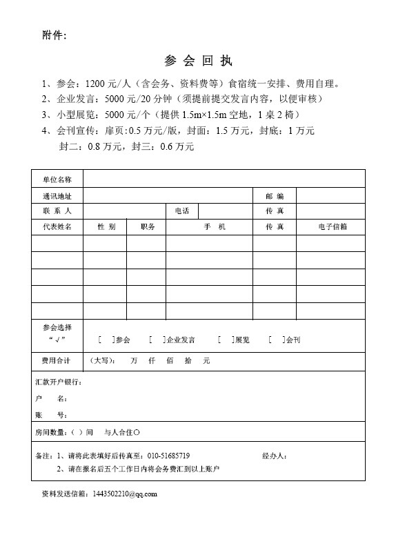 (3)企業(yè)代表可在會(huì)上發(fā)放介紹企業(yè)的廣告、宣傳資料等,每單位代表除按一般 代表收取會(huì)議費(fèi)外,另收5000元資料交流費(fèi)。