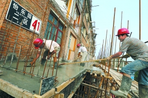 昨天,在通州區(qū)怡樂園二區(qū)綜合整治工程現(xiàn)場,北京城建的工人師傅正在緊張地進行樓體南側加建部分混凝土首層頂板澆筑找平施工。該工程是通州區(qū)住建委在老舊小區(qū)怡樂園二區(qū)進行的老舊房屋整治工程項目,涉及17032平方米樓體面積的抗震加固。經過加固改造后抗震設防裂度為8度,安全等級達到二級。本報記者方非攝