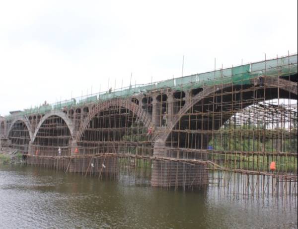 經(jīng)過一個(gè)月緊張的橋梁加固施工,已完成腳手架搭設(shè),主拱圈鋼筋1-4跨綁扎和腹拱圈和輔跨拱圈植筋和封縫灌漿,第一跨主拱圈側(cè)面和拱背混凝土也已澆筑完畢,完成總進(jìn)度的30%。目前,正在加緊實(shí)施腹拱圈和輔跨拱圈混泥土灌漿工作。