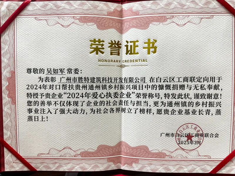 近日,廣州市勝特建筑科技開發(fā)有限公司收到一份特殊的榮譽(yù)——由廣州市白云區(qū)工商業(yè)聯(lián)合會頒發(fā)的 “2024年愛心執(zhí)委企業(yè)” 榮譽(yù)證書。該證書是為表彰公司在2024年對口幫扶貴州通州鎮(zhèn)鄉(xiāng)村振興項(xiàng)目中,展現(xiàn)出的慷慨捐贈與無私奉獻(xiàn)精神。