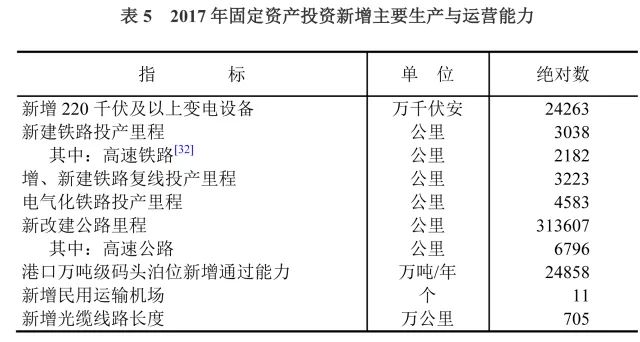 從固定資產(chǎn)投資新增主要生產(chǎn)能力看,2017年,我國新建鐵路投產(chǎn)里程3038公里。其中新增高速鐵路2182公里;增、新建鐵路復(fù)線投產(chǎn)3223公里;電氣化鐵路投產(chǎn)4583公里。2017年,我國新改建公路313607公里。其中高速公路里程數(shù)達到6796公里。我國建成了世界上最大的高速公路網(wǎng)和高鐵運營網(wǎng)。