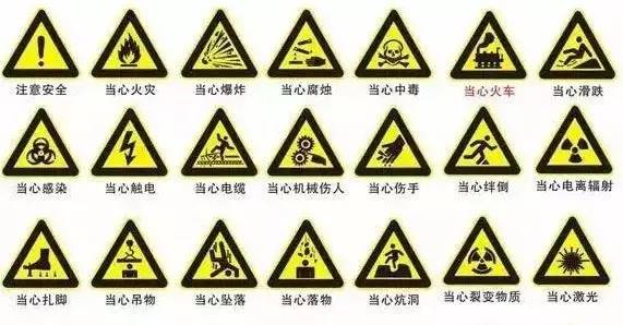 (2)警告標(biāo)志,即“△”,三角的背景用黃色,三角圖形和三角內(nèi)的圖像均用黑色描繪,警告人們注意可能發(fā)生的各種危險(xiǎn);