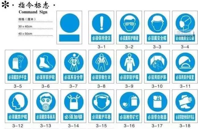 (3)指令標(biāo)志,即“○”,在圓形內(nèi)配上指令含義的顏色——藍(lán)色,并用白色繪畫必須履行的圖形符號,構(gòu)成“指令標(biāo)志”,要求到這個地方的人必須遵守;