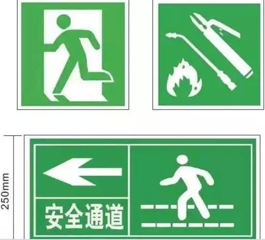 (4)提示標(biāo)志,以綠色為背景的長方幾何圖形,配以白色的文字和圖形符號,并標(biāo)明目標(biāo)的方向,即構(gòu)成提示標(biāo)志,如消防設(shè)備提示標(biāo)志等。