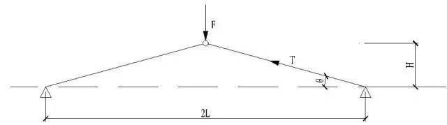 基于此,再看以下示例:有兩根相互鉸接的二力桿,兩端是鉸接支座,支座間距為2L,假設(shè)L為常數(shù),θ為變量,中間受到一個(gè)豎直向下的集中力F作用,如圖2所示。