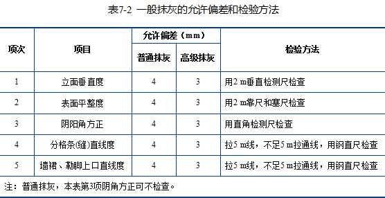 一般抹灰工程質(zhì)量的允許偏差和檢驗方法應(yīng)符合表7-2的規(guī)定。